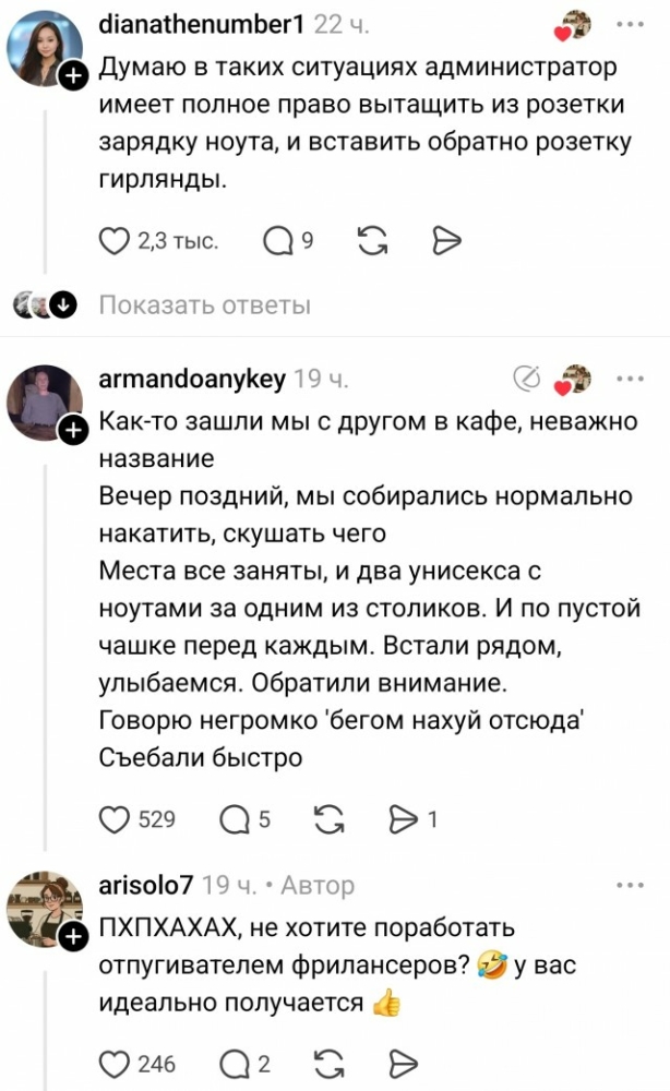 Не ну допустим в кафешках, где специально куча розеток - это норм. Но вот когда мАсквичка приходит в пельменную (в пельменную, сука!, не в смузишную, не в рафо-миндальнишную, а в пельменную, сука!) и восседает одна за столиком для четверых аки наследница императрицы с чашкой кофе, так и и хочется