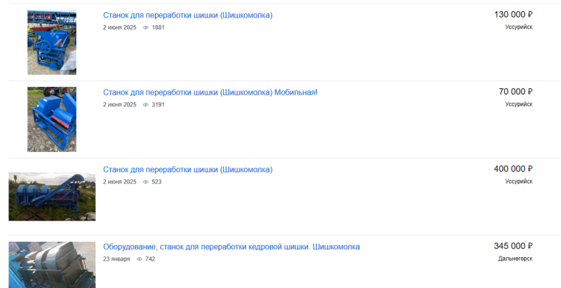 Мобильный шишкодёр "бурундук-2" стоит в пределах 60-70 тыр. Весит 95 кг, можно в легковушке в лес отвезти, для переноски к месту переработки разбирается на 5 модулей. Производительность 60 мешков в час, т.е 1500 кг лущёного ореха. Машина окупается за один день работы.
